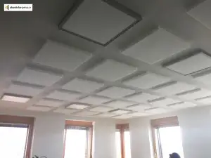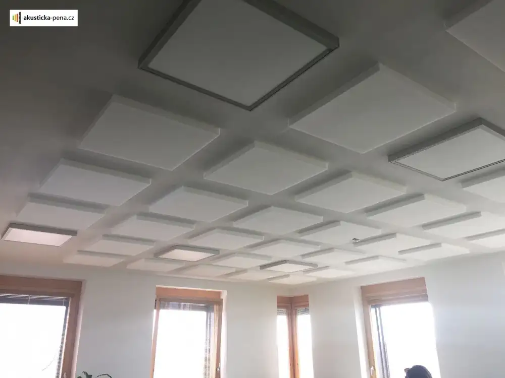 Pro akustickou absorpci stropu se nejčastěji volí melaminové panely nebo hladké pěnové panely. Jejich instalace je jednoduchá a zvládnutelná svépomocí – panely se lepí kontaktním lepidlem nebo se montují pomocí průmyslového suchého zipu. Výsledek je patrný okamžitě po instalaci.